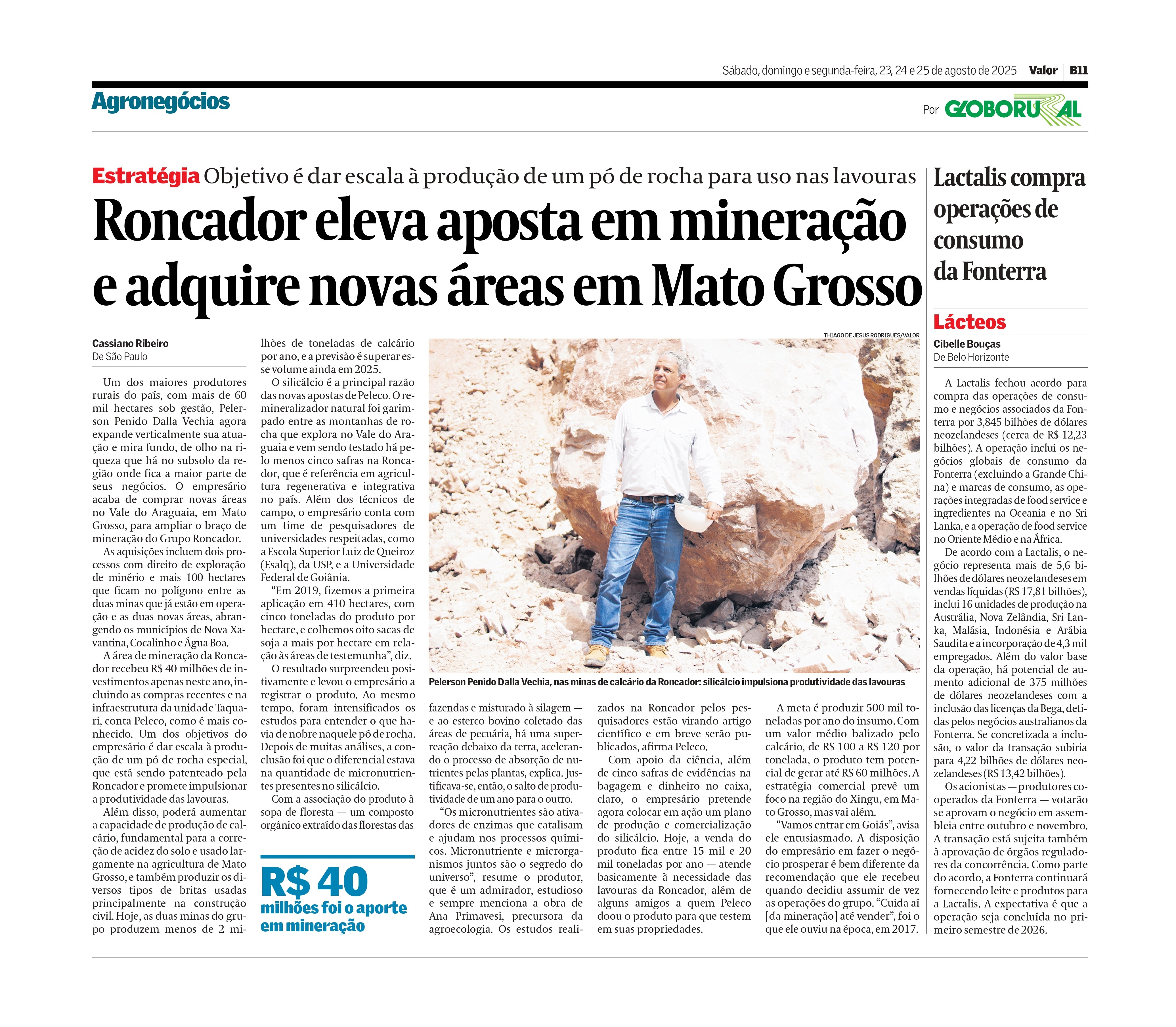 A área de mineração da Roncador recebeu R$ 40 milhões de investimentos apenas neste ano, incluindo as compras recentes e na infraestrutura da unidade Taquari, conta Peleco, como é mais conhecido. Um dos objetivos do empresário é dar escala à produção de um pó de rocha especial, que está sendo patenteado pela Roncador e promete impulsionar a produtividade das lavouras.
